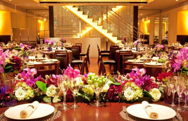 - ・ 音響 ・ ワイヤレスマイク2本 ・ プロジェクター ・ 大型スクリーン ・ 照明(ピンスポット/ミラーボール) ・ 高砂装花